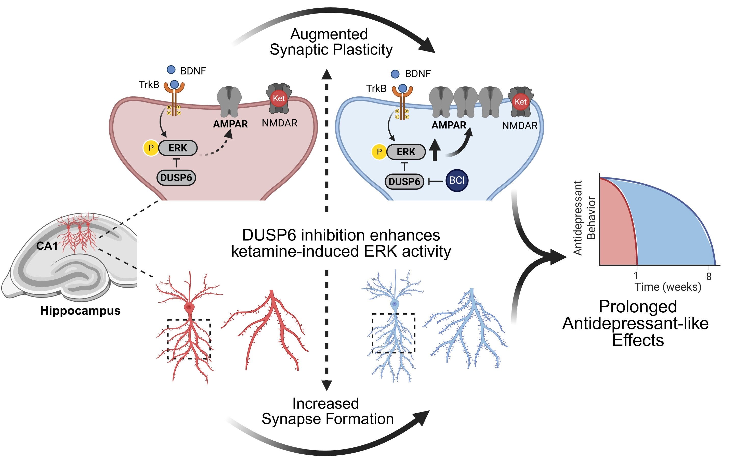 DUSP6 inhibitor (BCI) to increase sustained ERK activity increases Ketamine’s antidepressant effects from 1 weeks to 8 weeks and neuroplasticity