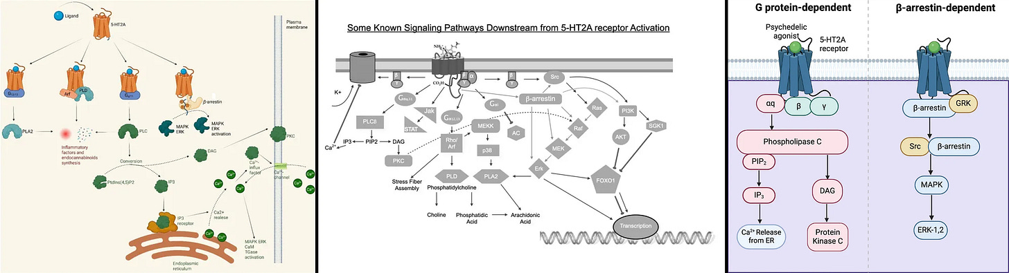 There hasn’t been any review article that put all the pathways (G-proteins and β-arrestin) together and helping understand which pathway actually does what, like contributing to hallucinations (HTR) or antidepressant effects/neuroplasticity.