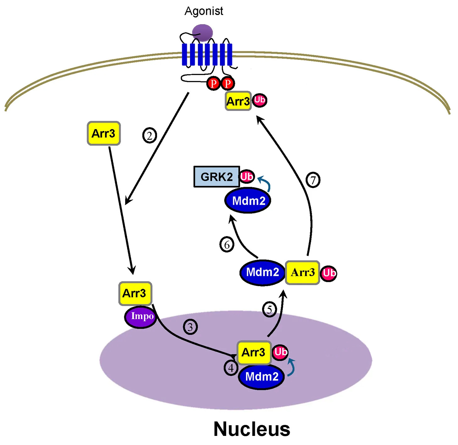 But when β-arrestin 2 enters the nucleus, Mdm2 ubiquitinates β-arrestin 2 and they form a complex together, the Mdm2 unmasks β-arrestin 2’s strong NES, then the β-arrestin2/Mdm2 complex exit the nucleus together [x, x, x, x].