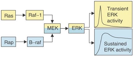 >Rap1>B-Raf>MEK>sustained ERK activity