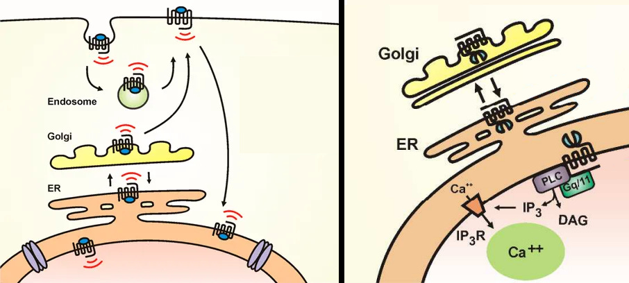 mGluR5 has been found to be able to move between the golgi and ER (endoplasmic reticulum), back and forth, and when agoniszd by Glutamate, can activate signaling in these intracellular compartments [x, x].
