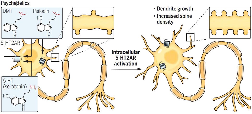 This explains why Serotonin doesn’t produce significant neuroplasticity, because it’s neuronally impermeable, so cannot access intracellular 5-HT2A.