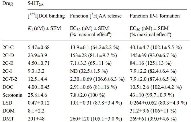 Table of psychedelics efficacy for arachidonic acid (AA) release