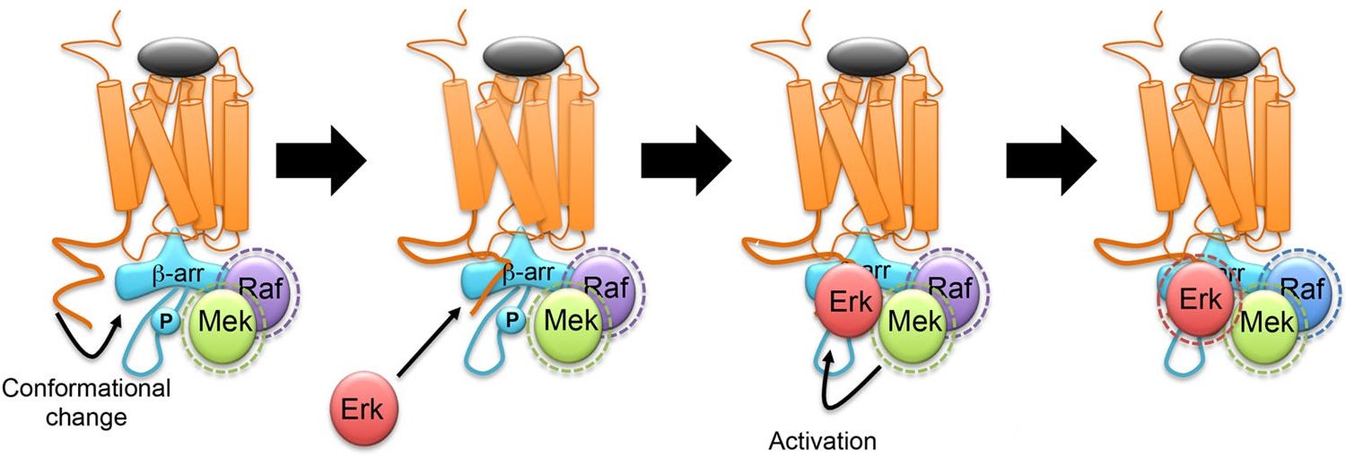 Additionally, the β-arrestin/C-Raf/MEK/ERK complex is very stable, long lasting, and acts like a shield from enzymes that otherwise would’ve terminated the C-Raf > MEK > ERK cascade.