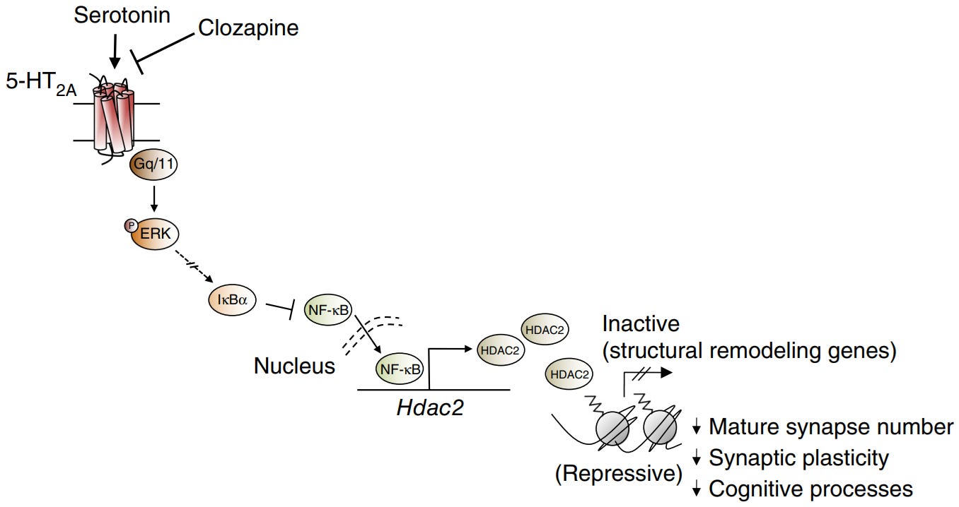 5-HT2A antagonism (Clozapine) results in downregulation of mGluR2, because it prevents 5-HT2A from downregulating HDAC2 [x].