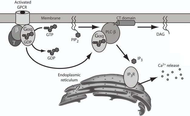 How the 5-HT2A Gq-protein (Gαq) pathway releases Ca2+ stored inside the ER (endoplasmic reticulum) out to the cytosol, the Ca2+ then activates PKC and CaM pathways