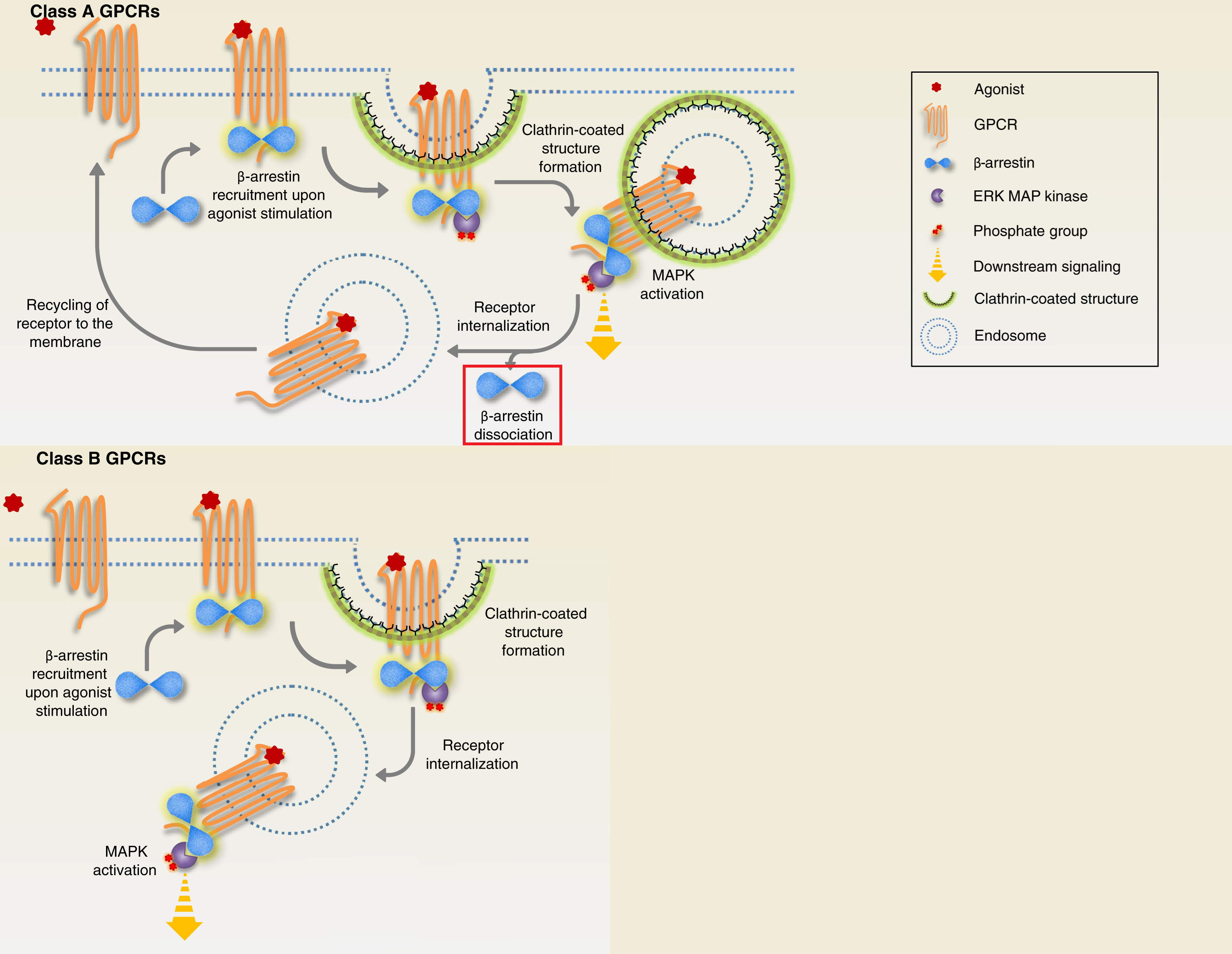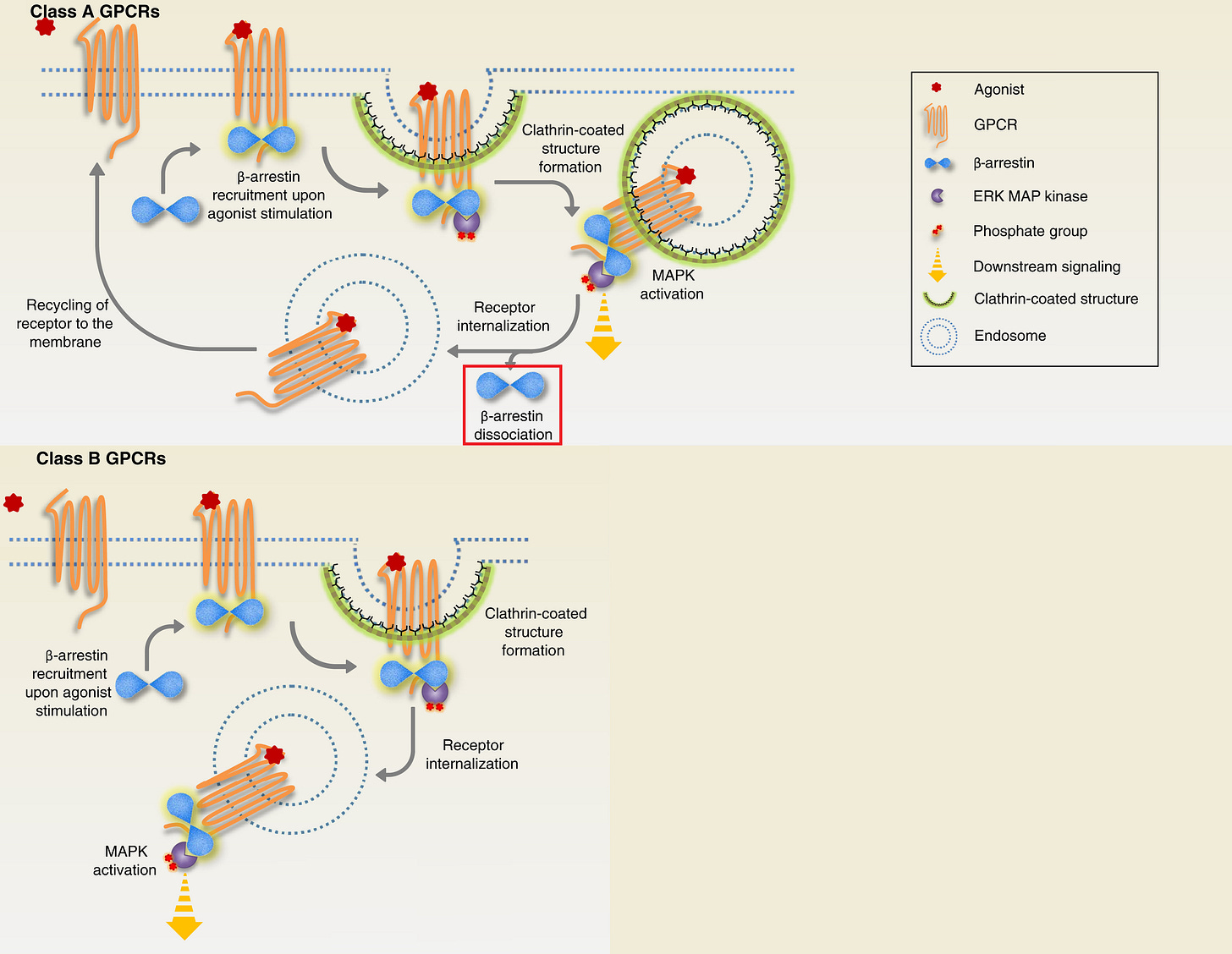 Class A receptors briefly makes the β-arrestin/C-Raf/MEK/ERK complex on the endosome, then β-arrestin “dissociates” from the complex on its own (highlighted in red square) and is able to translocate to the nucleus