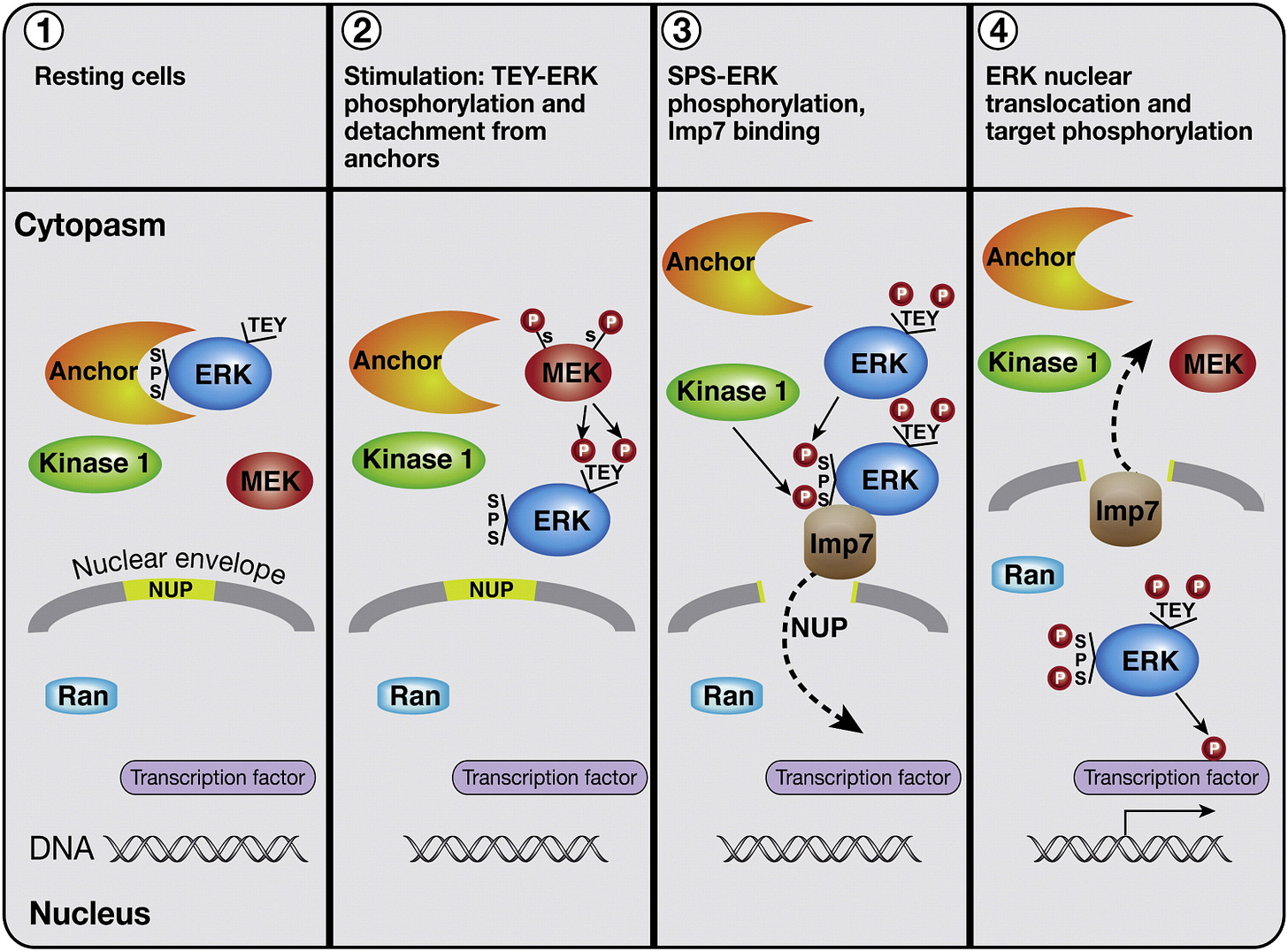 It’s an important ERK location distinction between the nucleus and cytosol, since ERK must be inside the nucleus to drive transcription, because the nucleus is where DNA and the transcription factors like CREB are located [x, x, x].